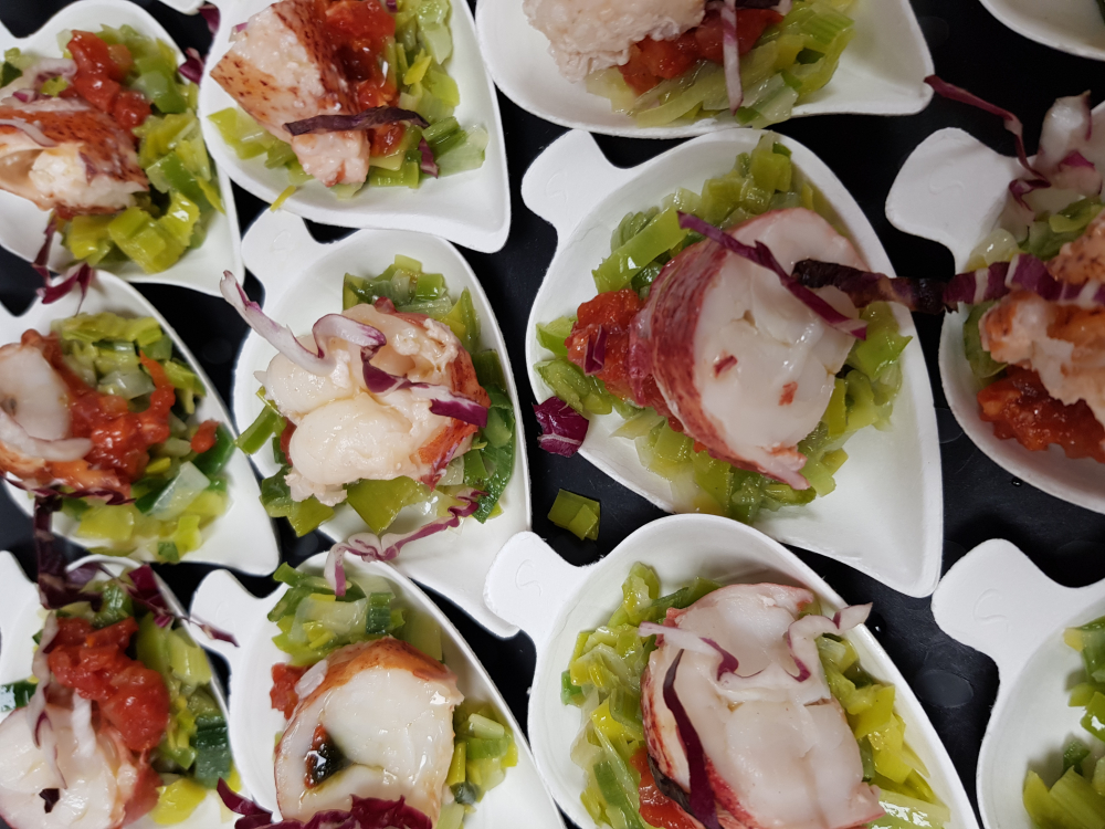 Poêlée de gambas et langoustines, étuvée de poireau, vinaigrette agrumes